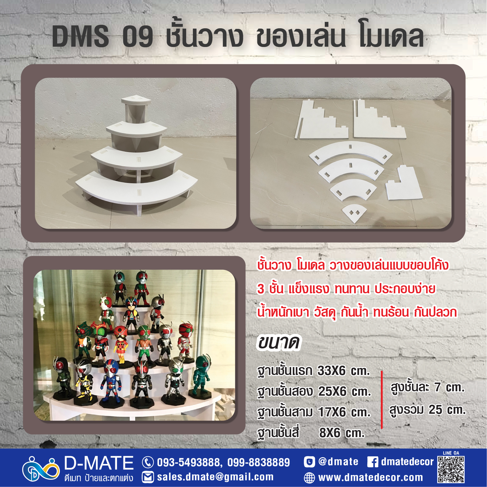 ขนาดตามภาพ ใส่ในตู้ ikea index ได้ สามารถ นำ4 อันมาต่อรวมกันเป็นวงกลมได้ วางภายใน ภายนอก ได้ มีคลิปการประกอบในรูปภาพ ขนาดตามภาพ สามารถ นำ4 อันมาต่อรวมกันเป็นวงกลมได้ ** ขั้นตอนการสั่งซื้อของดีเมท - สินค้าชั้นวางสำเร็จให้แจ้ง ชื่อสินค้า รหัสสินค้า - งานผลิตตามออเดอร์ ขอให้ลูกค้าแจ้ง รายละเอียด แบบ ขนาด ทางเราจะแจ้งราคากลับให้ครับ กรณีลูกค้าต้องการให้ออกแบบเพิ่มเติมจะมีค่าออกแบบ เช่น ออกแบบชั้น ปรับแก้แบบ วางแบบให้สเกลลงรายละเอียด เป็นต้น สินค้าสั่งผลิต (4-7 วัน) ** วิธีการวัดขนาดพื้นที่เบื้องต้น - วัสดุมีหลายประเภท พลาสวูด MDF ไม้จริง อื่นๆ - ส่งตรงทุกจังหวัด EMS (ขนส่งเอกชน) - รับฉลุลวดลายด้วยเครื่อง CNC - Laser ราคาโรงงาน ลูกค้าสามารถสอบถามเพิ่มเติมได้ที่ Line OA : @dmate (มี@ด้วยนะครับ) LineID : Tinno456 Tel : 093-5493888, 098-4455353 Fanpage : www.facebook.com/dmatedecor Website : www.dmatedecor.com E-mail : sales.dmate@gmail.com วัสดุพลาสวูด (Plastwood) เกิดจากการนำผง PVC มาผสมสารเคมีต่างๆรวมกัน โดยผ่านขบวนการรีดออกมาเป็นแผ่นๆ คุณสมบัติของพลาสวูด (Plastwood) ปลวก มอด แมลงต่างๆไม่กินพลาสวูด ทนทานต่อความชื้น ทนน้ำ ไม่หดตัว ทนทานต่อไฟ ไม่ติดไฟ ติดไฟแล้วจะไม่ลาม ทนทานต่อแดด สารเคมี มีความยืดหยุ่นสูง สามารถดัดโค้งได้ดี มีน้ำหนักเบาเมื่อเทียบกับวัสดุมกล้เคียงกัน สามารถเป็นฉนวนกันความร้อนและเสียงได้ สามารถคัด เจาะ ตอก ยิงแมกได้ สามารถทำสีได้ เป็นผลิตภัณฑ์ทดแทนไม้ในอนาคต ใช้ได้ทั้งภายในและภายนอกอาคาร วิธีประกอบชั้นวาง 4ชั้น ทรงโค้ง (DMS09) ![]() ![]() |