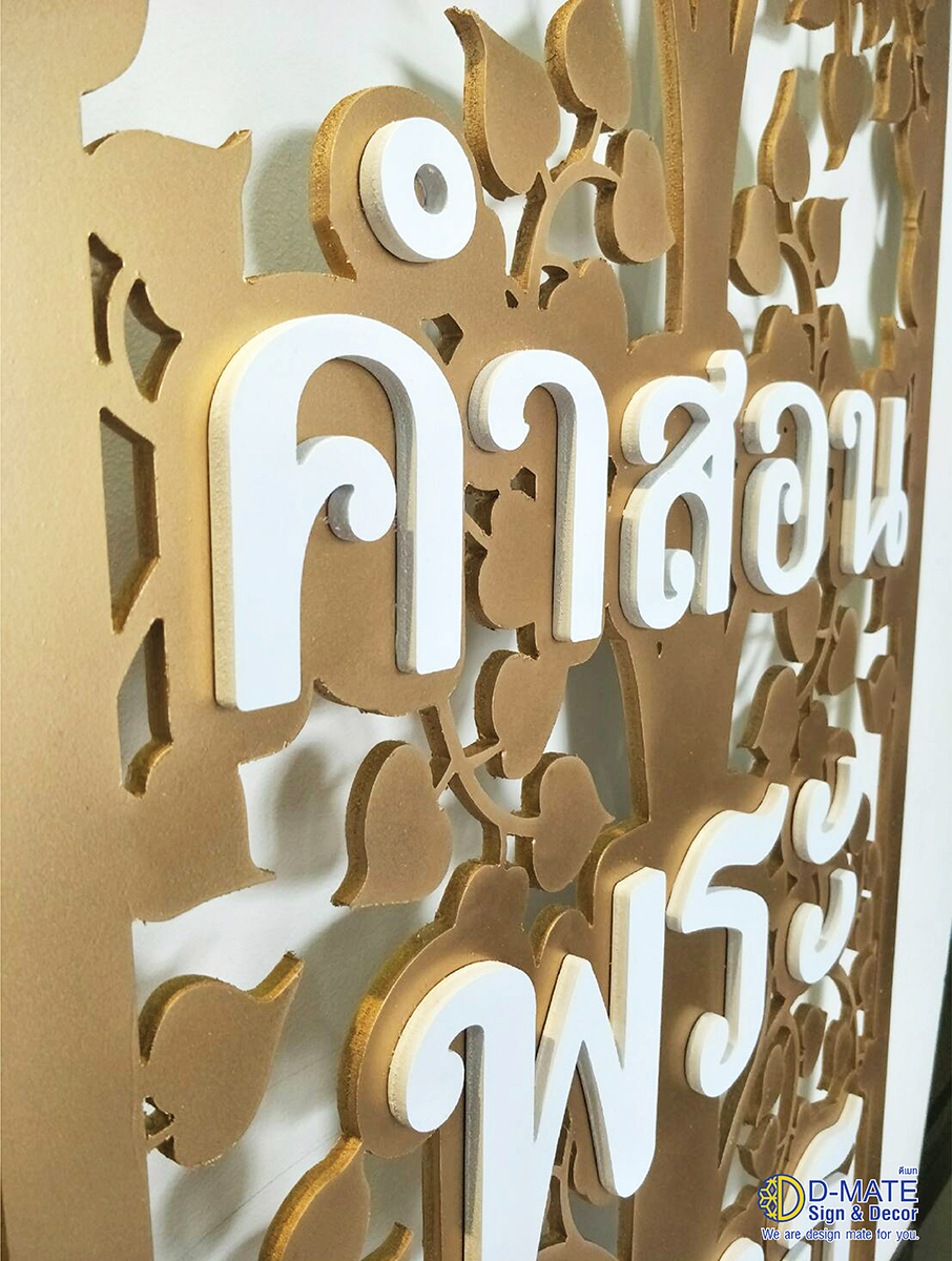 แผ่นฉลุตกแต่ง "คำสอนพระพุทธเจ้า" วัสดุพลาสวูดหนา 6+6 มิล สีทองและสีขาว